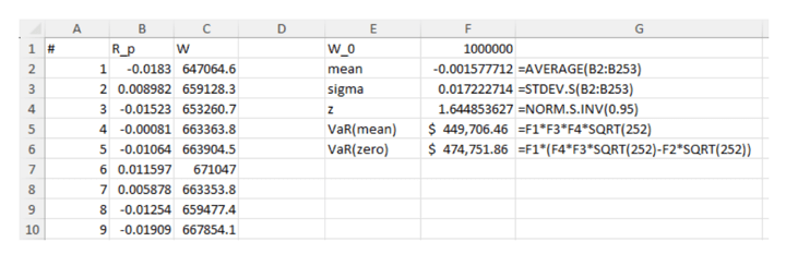 In Image 2.1.1 the C column contains the values of portfolio changing due to fluctuations in portfolio returns. Some sample calculation formulas are given in column D. Initially, computations start by $1,000,000 from below and ends up above in the second row due to descending order of dates.