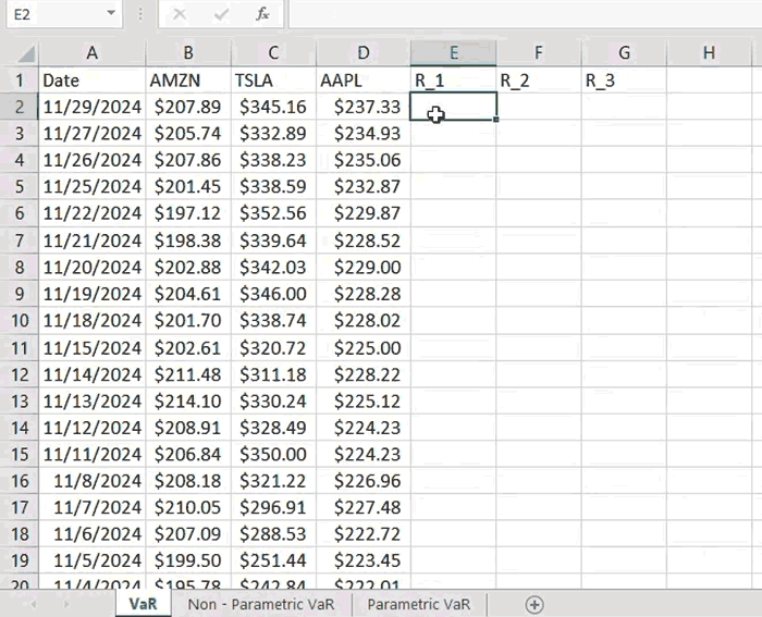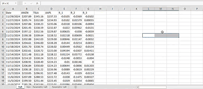 Given one-year monthly data of AMZN, TSLA and AAPL within the time interval of 11/30/2023-11/29/2024, we compute the portfolio VaR and related quantities explained below. First, we compute the asset returns as