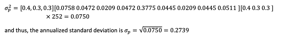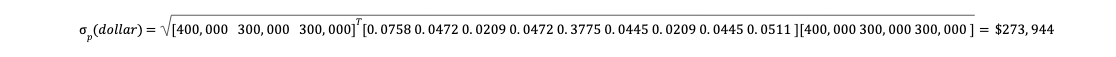 Alternatively, we could have first computed the portfolio standard deviation in terms of dollar exposures and then compute VaR. First, we need the vector