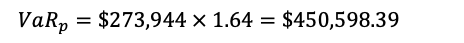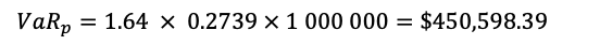 out of which we can directly compute the portfolio VaR assuming the initial portfolio value W = $1,000,000 and the confidence level of 95% (i.e. z = N-1(0.95) ≈ 1.64).