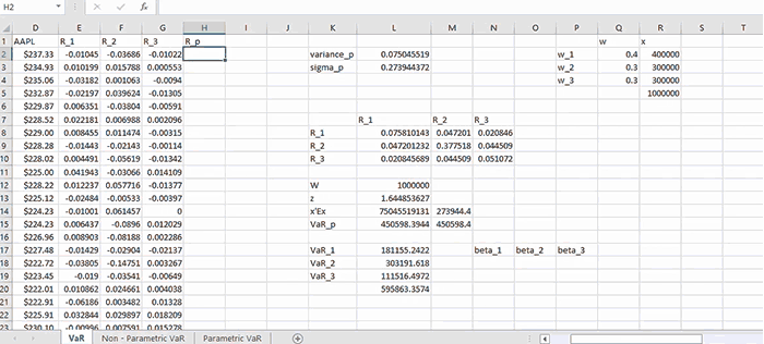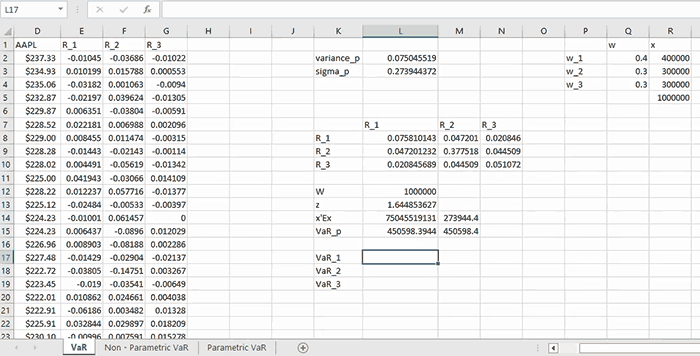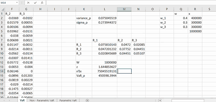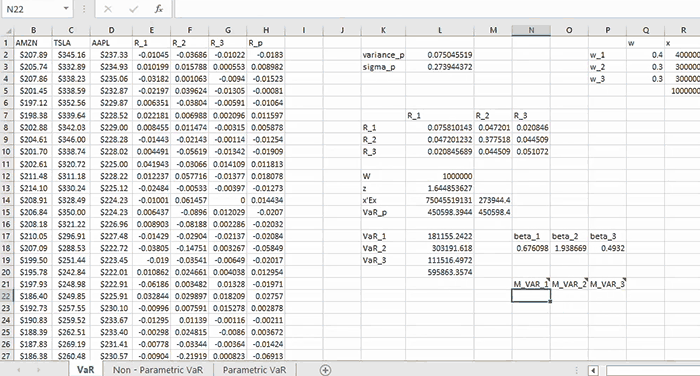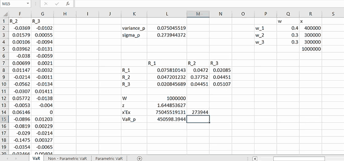 Note that the sum of the individual VaRs is $595,863.36 which is obviously not equal to the portfolio VaR. Portfolio VaR is less since it takes advantage of the diversification effect.