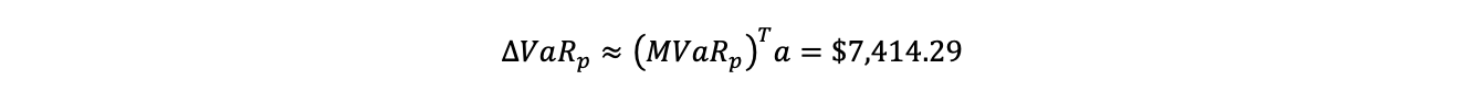 Let us begin with the initial portfolio of $1 000 000 with positions vector x = [x1 x2 x3] = [400,000 300,000 300,000]. The VaR of such portfolio was computed in Example 2.1 to be $450,598.39. Now consider a vector a = [10,000 5,000 0] of changes in positions in each asset. i.e. we put an additional $10,000 into AMZN, $5,000 into TSLA and we do not change our position in AAPL. If we computed the VaR of the new portfolio by (3.1.5), that would become