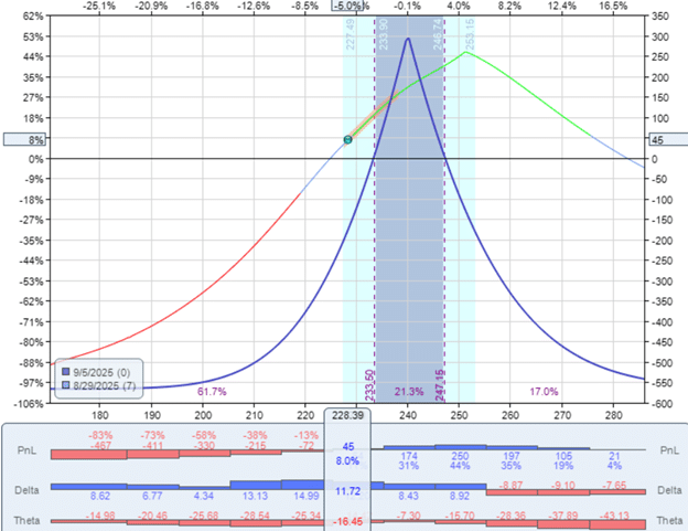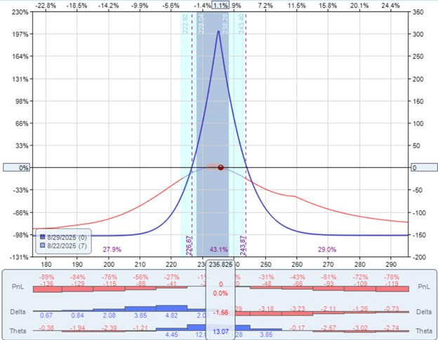 As is typical of calendars, the trade has a positive theta, meaning it profits from the passage of time.