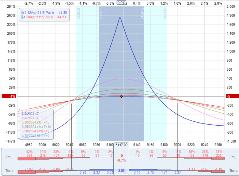 For example, below is a typical at-the-money calendar on SPX with the short put option 22 days to expiration.