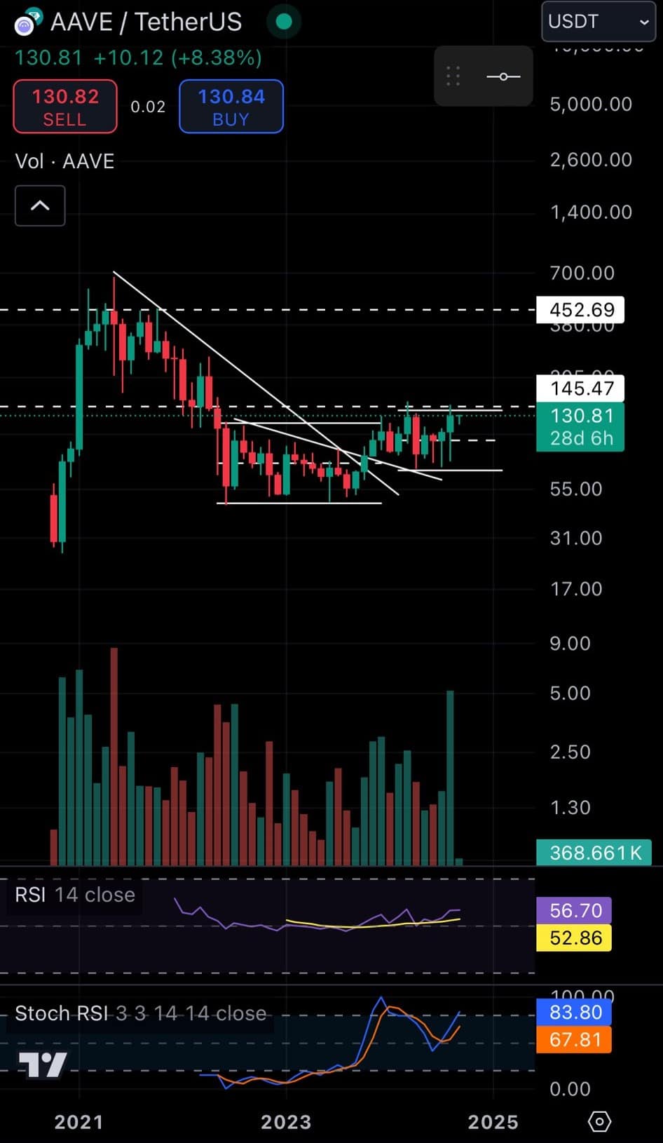 AAVE’s price chart is impressive on monthly timeframe, after breaking the downtrend and consolidating, with signs of an impending breakout. This breakout could signal a significant upward movement in the AAVE/USDT pair.