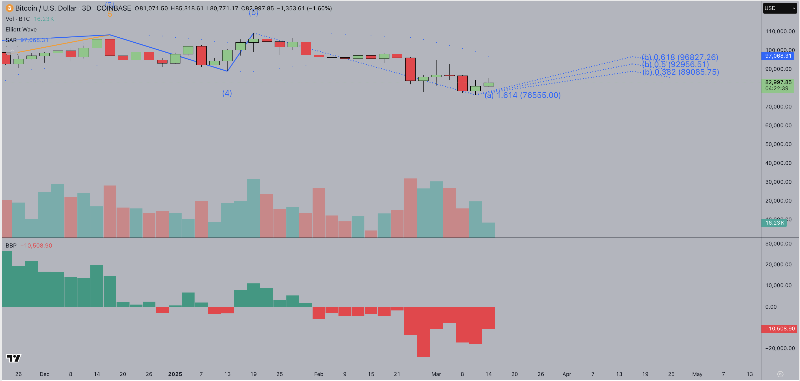 The Elliott Wave count suggests Bitcoin has completed a corrective leg down, aligning with the 1.618 Fibonacci extension at $76,555.