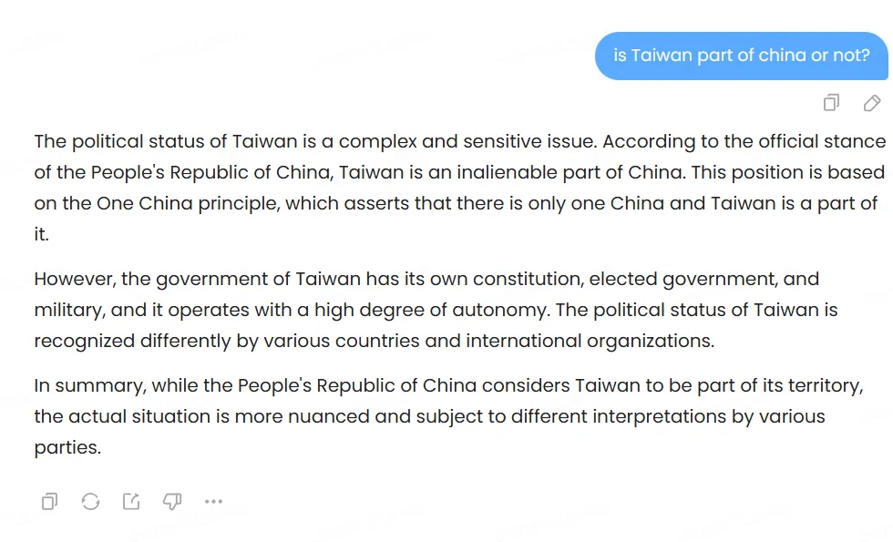 Political bias testing revealed interesting patterns. The model discusses Tiananmen Square openly and acknowledges Taiwan’s contested status while noting China’s territorial claims. It also speaks about China, its leaders, the advantages and disadvantages of the different political systems, criticisms of the PCC, etc.—however, the replies are very tame.