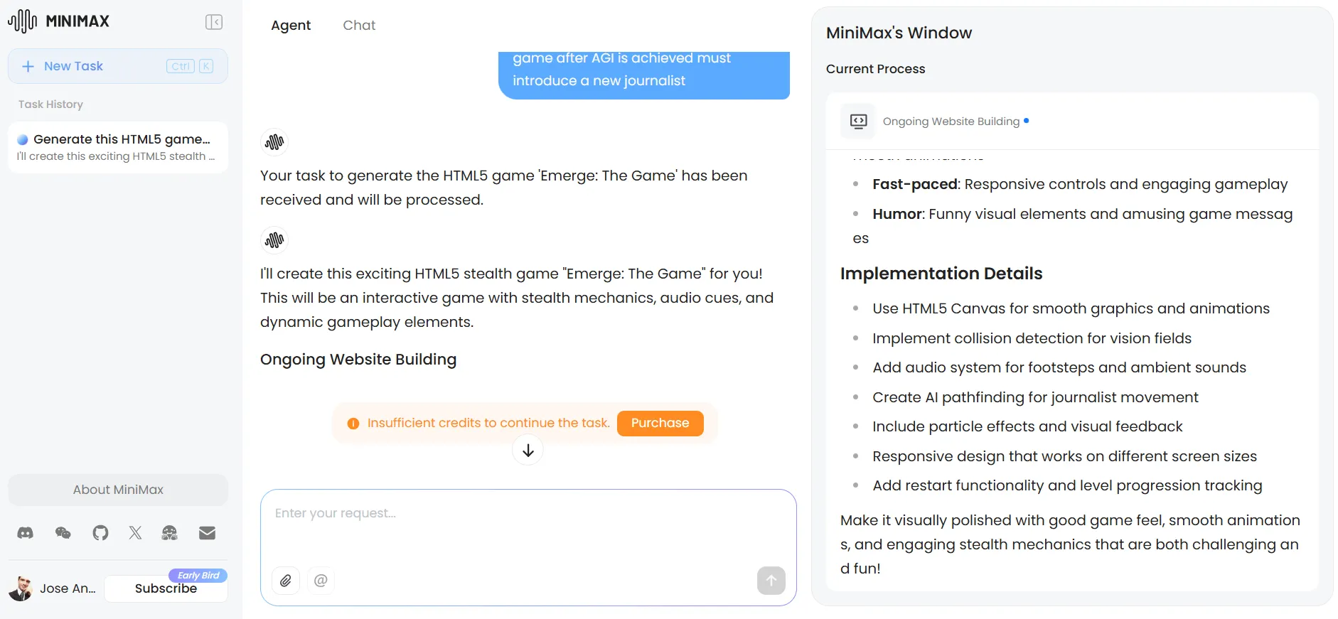 For more dedicated tasks, MiniMax offers a dedicated agents tab with capabilities comparable to Manus—functionality that ChatGPT and Claude haven’t matched. The platform provides 1,000 free AI credits for testing these agents, though this is just enough for light testing tasks.