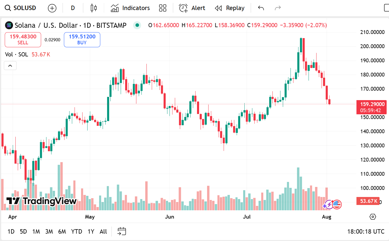 Solana fared slightly better but still dropped to $164.59, losing 0.49%.