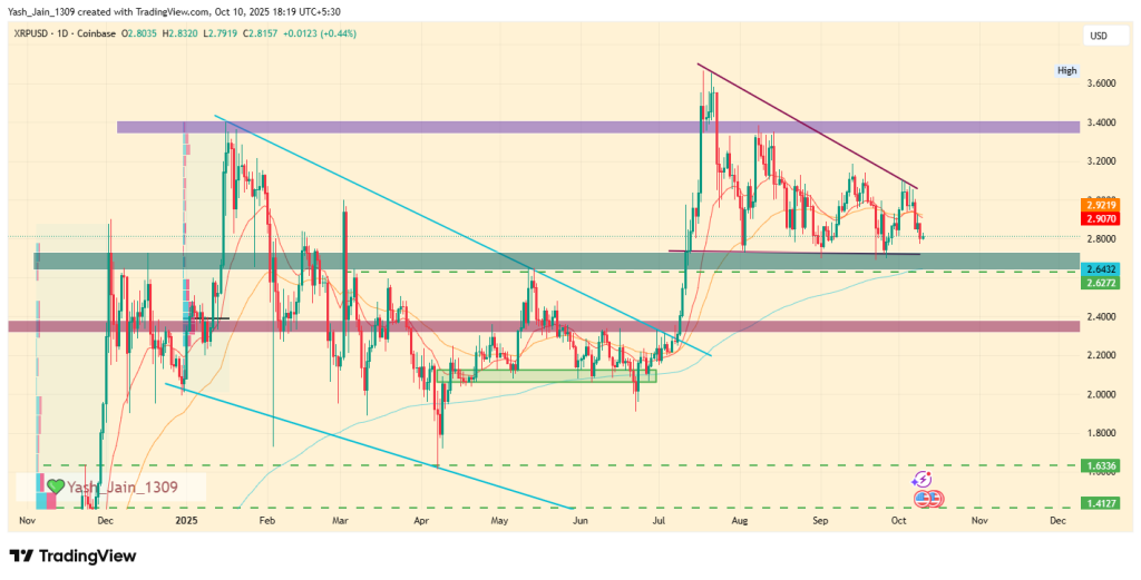 From a technical perspective, the XRP price in USD is consolidating within a pattern commonly known as a descending triangle, aligning with broader market FUD.