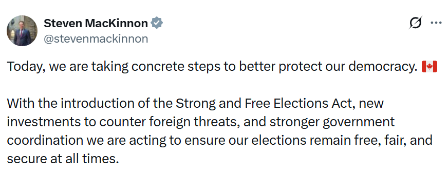 “With the introduction of the Strong and Free Elections Act, new investments to counter foreign threats and stronger government coordination, we are acting to ensure our elections remain free, fair and secure at all times,” he said.