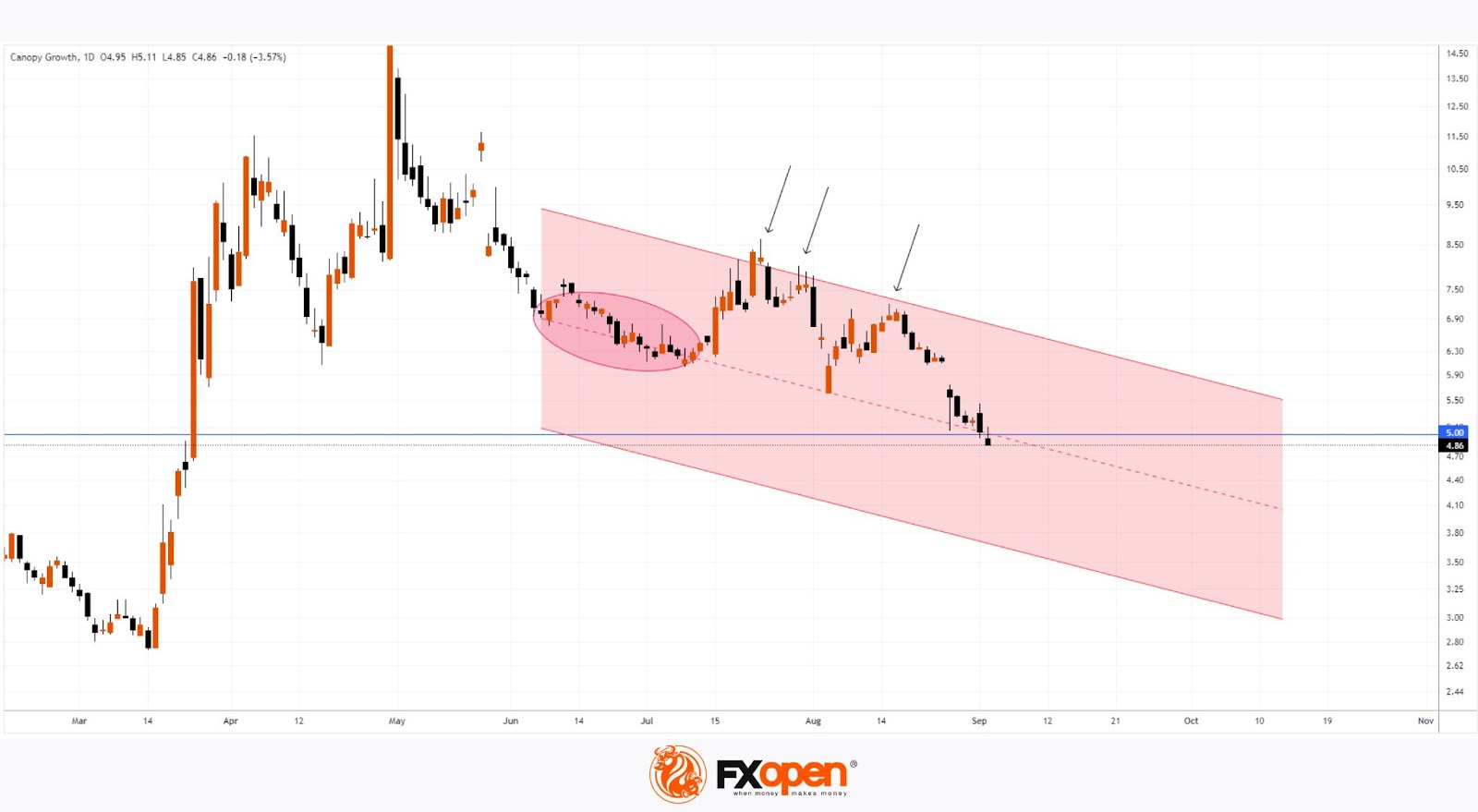 A technical analysis of the daily chart for Canopy Growth Corporation (CGC) shows that the stock is trading within a downward channel (marked in red), with the following observations: