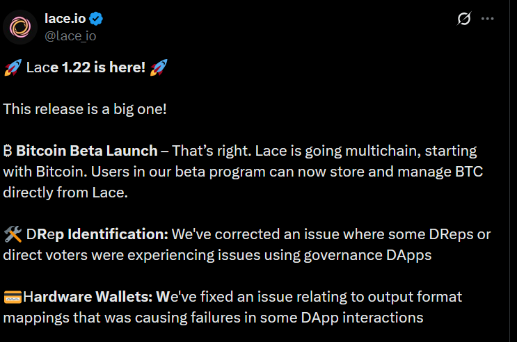 Cardano ADA Lace Wallet Goes Cross-Chain & Integrates Bitcoin Blockchain