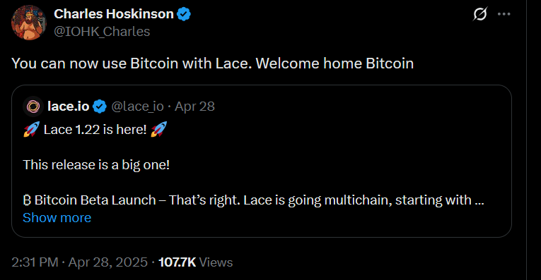 Cardano’s Lace wallet, dubbed a “powerhouse’ by Charles Hoskinson, has added Bitcoin support, part of Lace’s enhanced cross-chain support, bridging the Cardano network to Bitcoin.