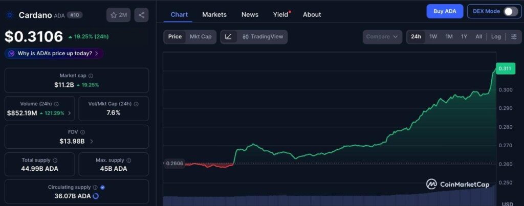 Additionally, analyst Cardanians (CRDN) reported that ADA recently surpassed $0.31, rising 19.25% in 24 hours and ranking as the sixth-largest gainer among all cryptocurrencies.