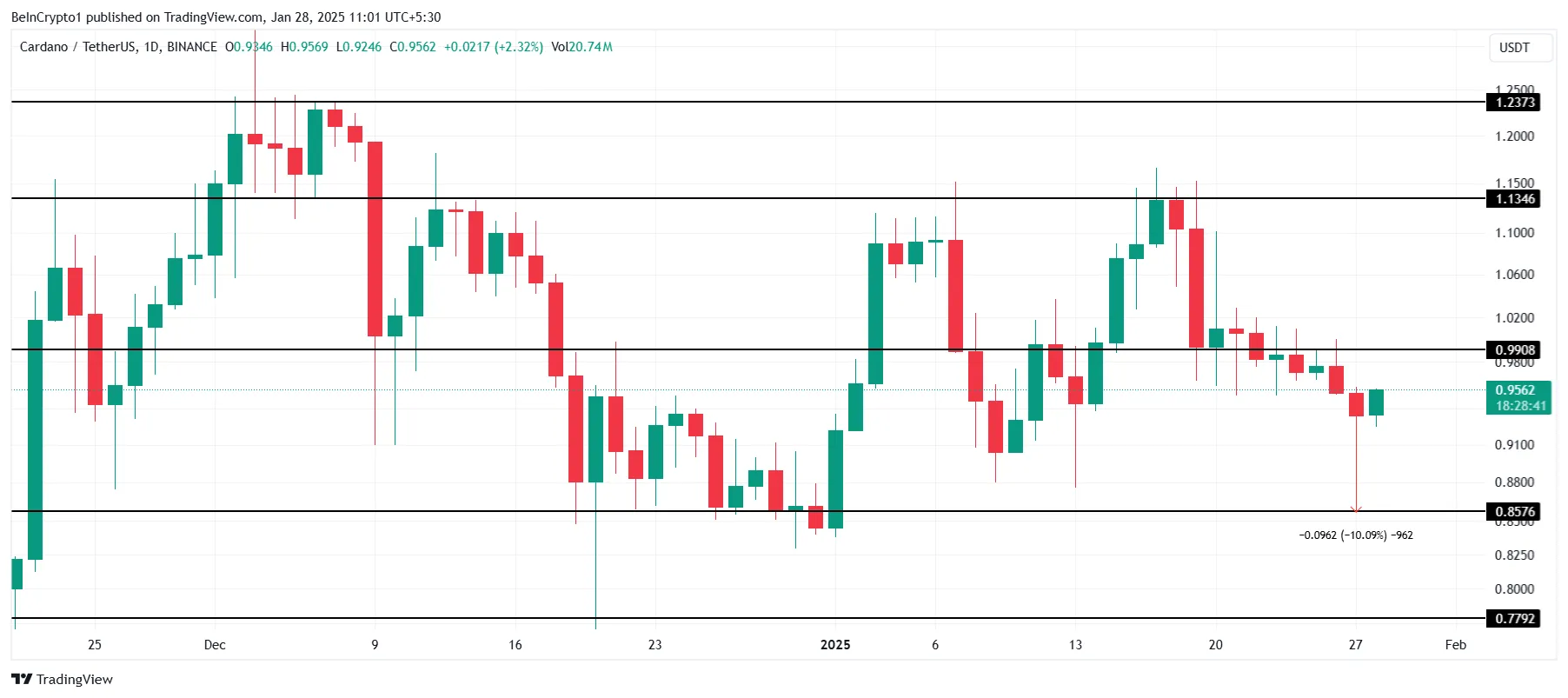 Cardano’s price has dropped nearly 10% in the past 24 hours, currently standing at $0.95. The altcoin remains below the critical barrier of $0.99, highlighting its struggle to reclaim key resistance levels amid ongoing selling pressure and weak market sentiment.