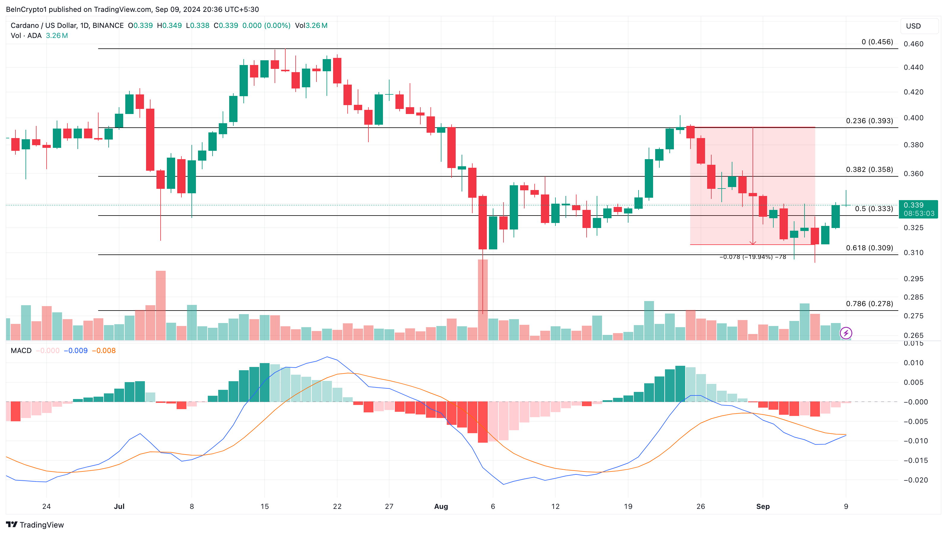 On the daily chart, Cardano’s price has formed a bearish divergence with the Moving Average Convergence Divergence (MACD) indicator, which measures momentum. A bearish divergence occurs when the MACD’s trend does not align with the price movement. Recently, ADA jumped to $0.34 following an increase between August 25 and September 6.
