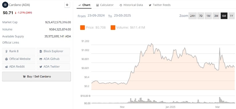 Cardano (ADA) was trading at around $0.71, down 1.21% in the last 24 hours at press time. Source: Brave New Coin