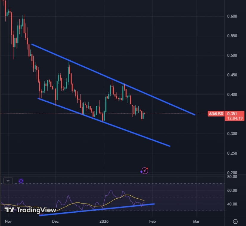 ADA trades within a descending channel, with price compressing beneath trend resistance as traders watch for a breakout towards the $0.50 objective. Source: Sssebi via X