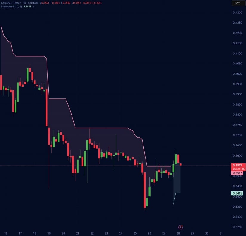 Cardano’s 4-hour Supertrend flips green for the first time in weeks, hinting at an early momentum shift as price eyes the $0.385–$0.40 recovery zone. Source: Jesse Peralta via X