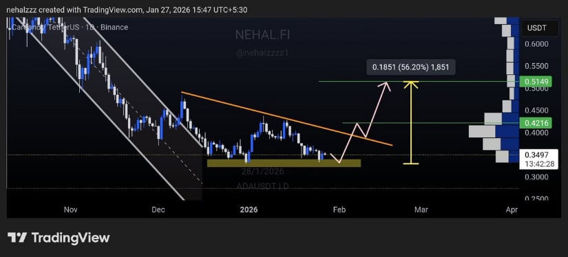 Nehal’s technical roadmap places ADA at the base of a potential breakout sequence. The chart highlights a transition from a falling structure into a higher-low formation near the $0.34–$0.35 region, an area that has repeatedly acted as demand. This zone aligns with the lower boundary of the corrective structure and marks where downside momentum has consistently stalled, suggesting sellers are losing control.