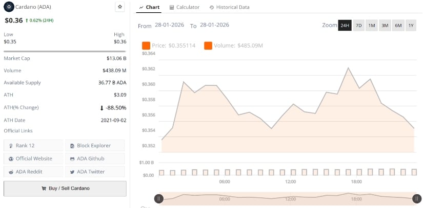 ADA Cardano has shown early signs of short-term strength following a rebound from the $0.34–$0.35 region, an area that has repeatedly attracted buyers. As of January 28, 2026, Cardano is trading near $0.36, posting modest gains while holding above recent swing lows.