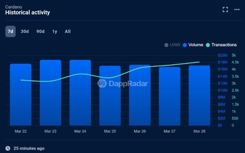 Cardano’s volume and transaction 7-Day stats. Source: Dappradar