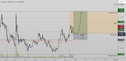 The formation is evident: $0.84 is the base of the latest bullish structure of ADA. Many timeframes concur in it and that is where there is likely to be smart money.