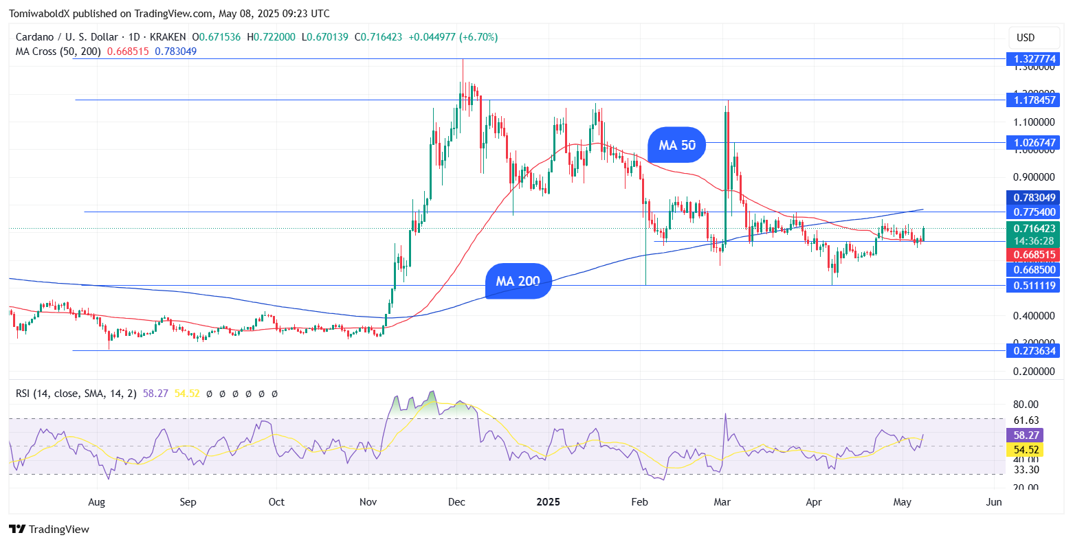 Cardano saw a strong surge in the early Thursday trading session, surging from $0.67 to $0.7189, returning well above the daily SMA 50, after falling beneath it since May 5. At press time, ADA was up 4.59% in the last 24 hours to $0.7185.