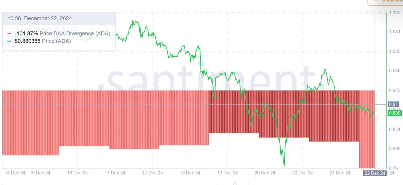 For starters, Cardano’s Price DAA divergence has remained negative over the past week. When this remains negative for a long period, it implies that the current ADA price and market valuation are not supported by growth in on-chain activities.