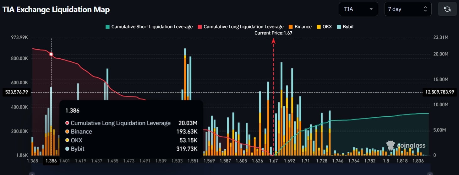 This indicates that traders strongly believe the TIA price is unlikely to fall below the $1.386 level anytime soon.