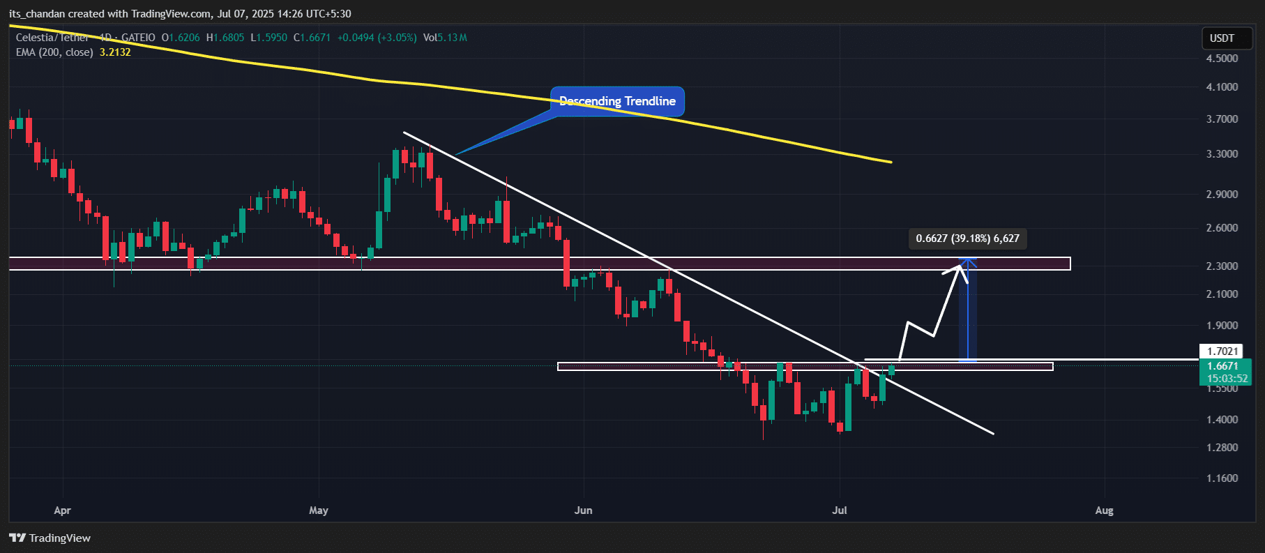 On the 7th of July, TIA surged by 12% and traded near $1.67 at press time. This price jump has attracted significant attention from investors and traders, leading to a 170% increase in trading volume.
