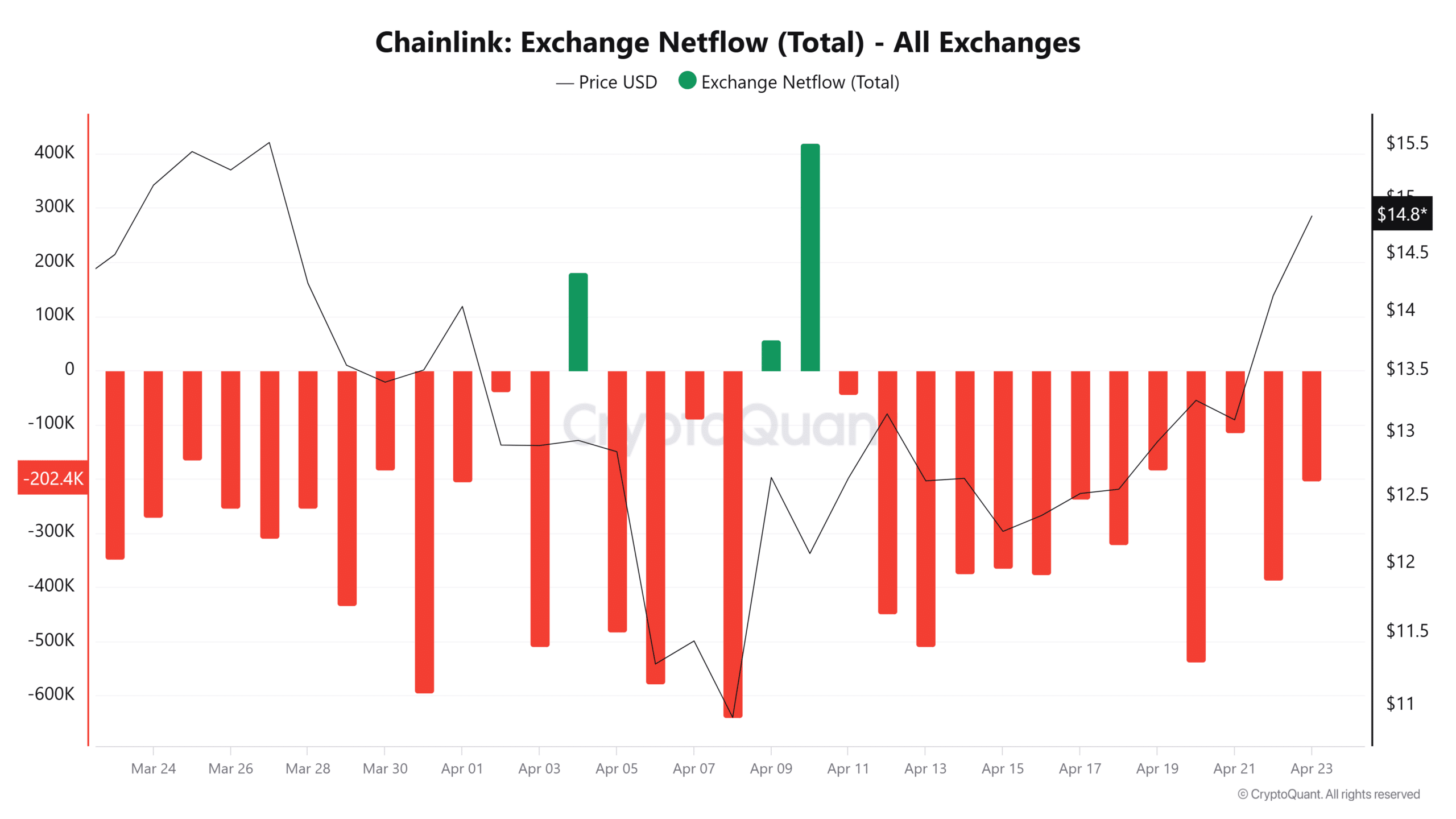 The growing accumulation is further evidenced by Chainlink’s Exchange Netflow, which has remained negative over the past 12 days.