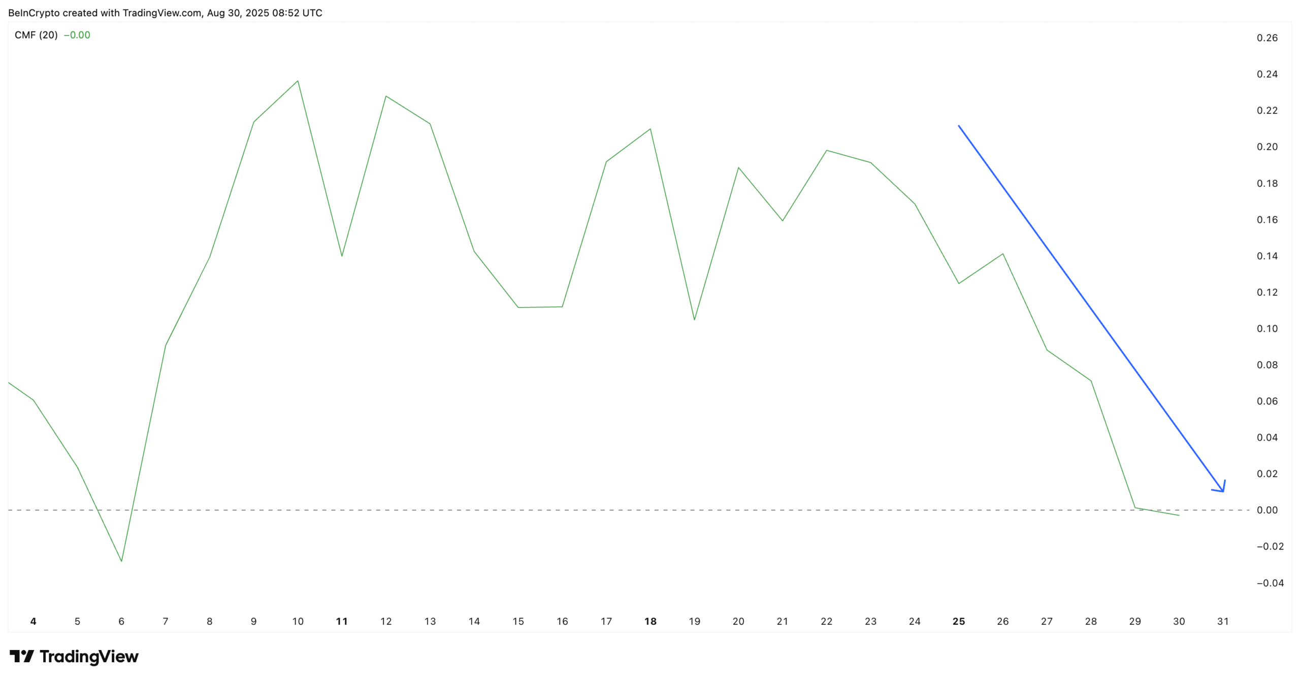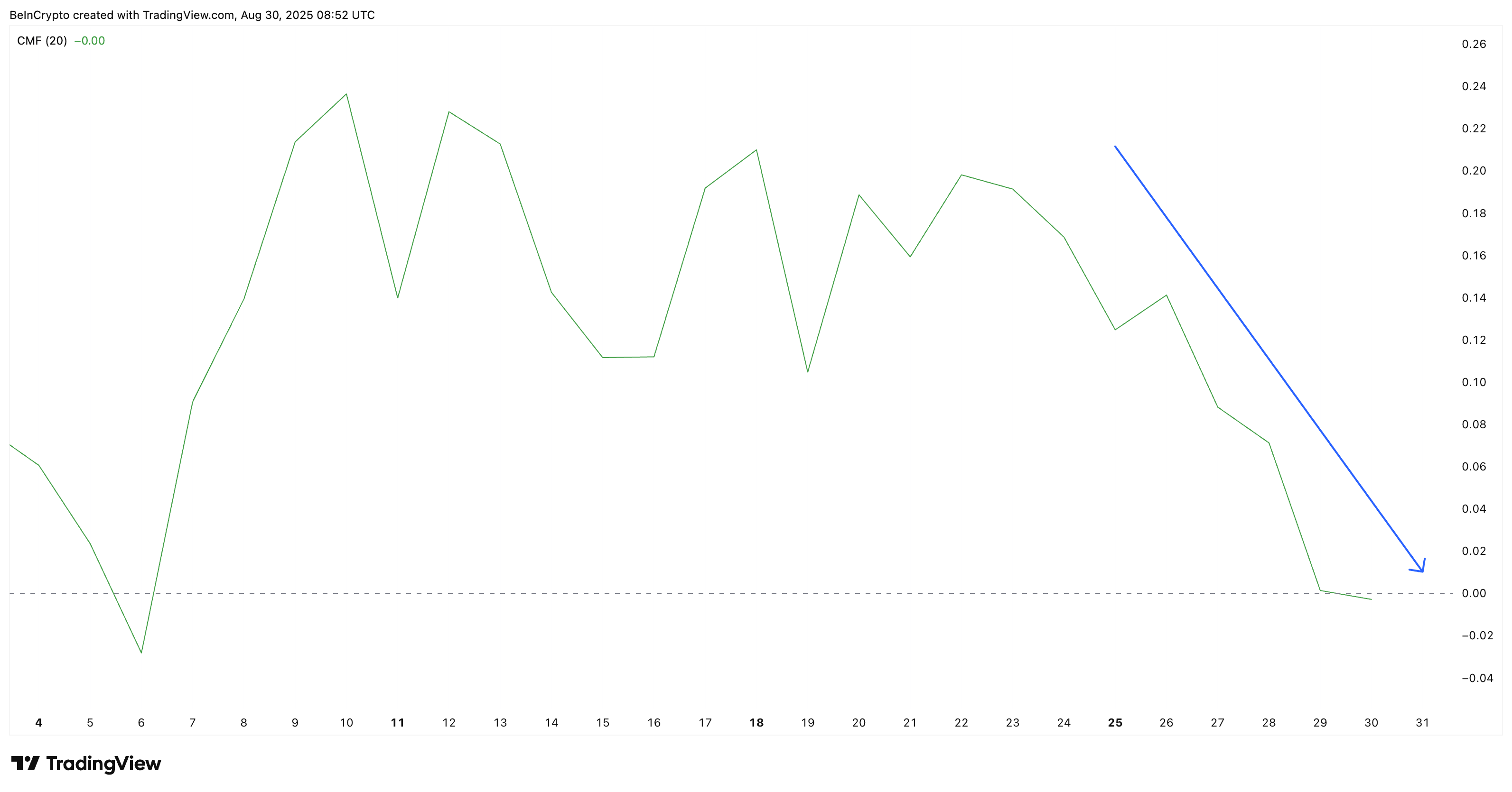Additionally, the Chaikin Money Flow (CMF), which tracks capital inflows and outflows, has trended downward since August 22 and finally slipped below zero on August 29 for the first time since August 6. This shift into negative territory signals fading buying pressure and capital inflows, strengthening the case for a potential pullback.