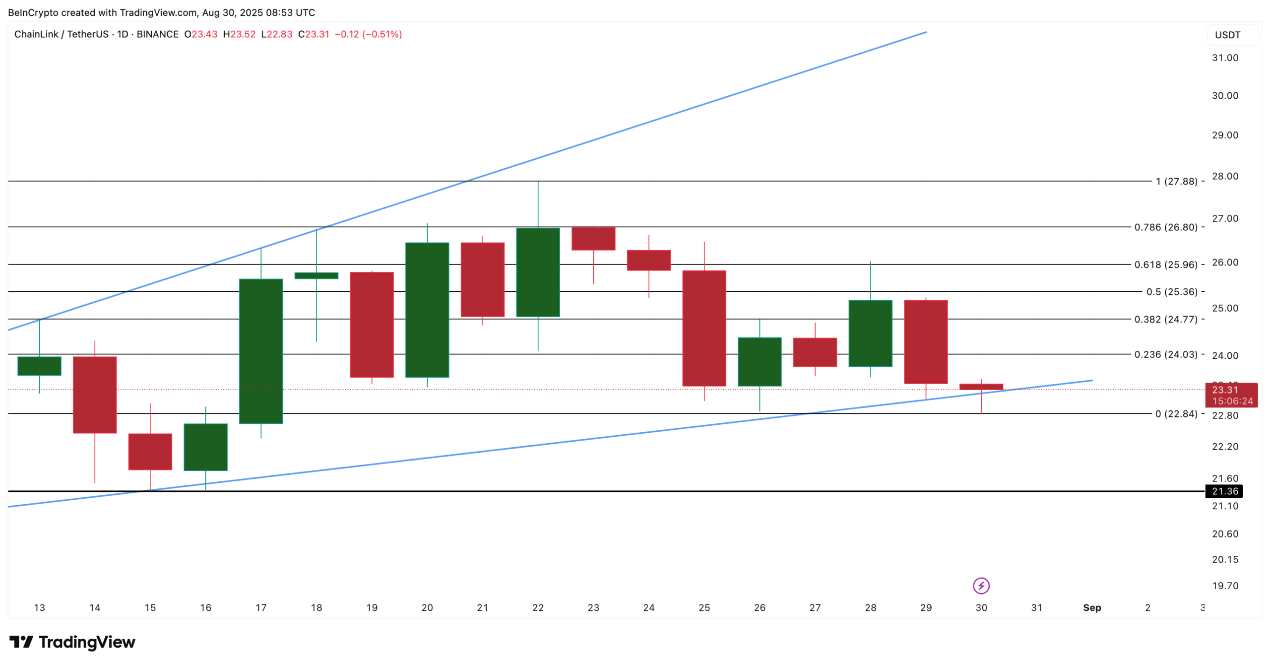 The daily chart reinforces this caution. The LINK price is currently trading at $23.31, sitting inside an ascending broadening wedge pattern — a structure often associated with loss of upward momentum near the end of a bullish phase. This “megaphone” like pattern is infamous to kickstarting bearish reversals, a risk that now looms over LINK.