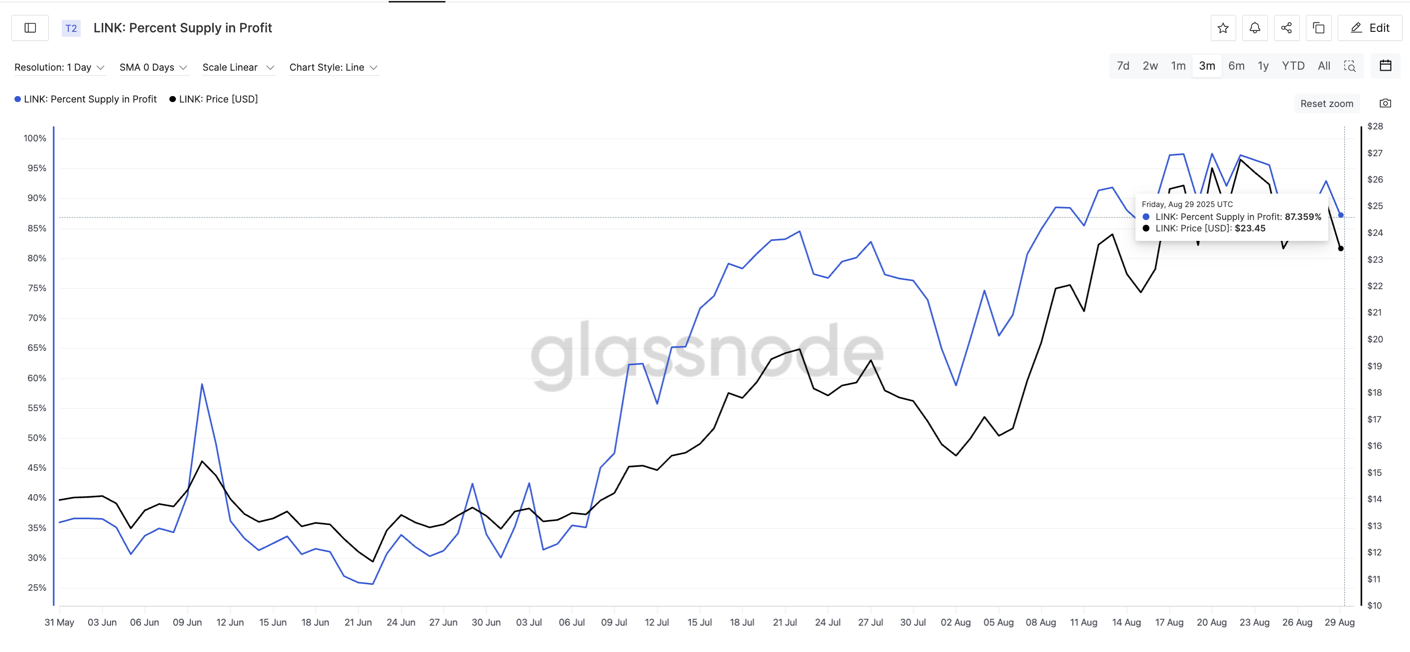 As of August 29, nearly 87.4% of the circulating supply is in profit, close to the recent peak of 97.5% seen on August 20. That peak coincided with the LINK price rally to $26.45, which quickly retraced by over 6% to $24.82 the following day.