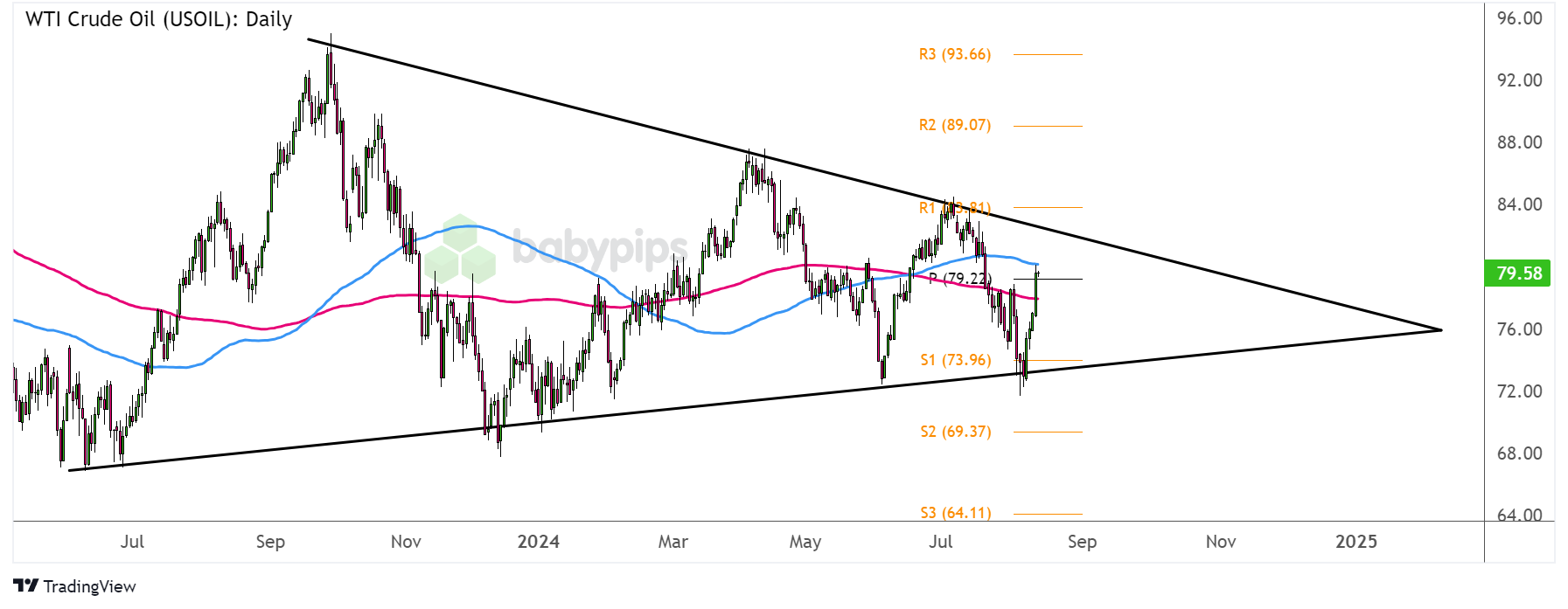 Crude oil has formed lower highs and higher lows since July last year, creating a symmetrical triangle visible on its daily chart.