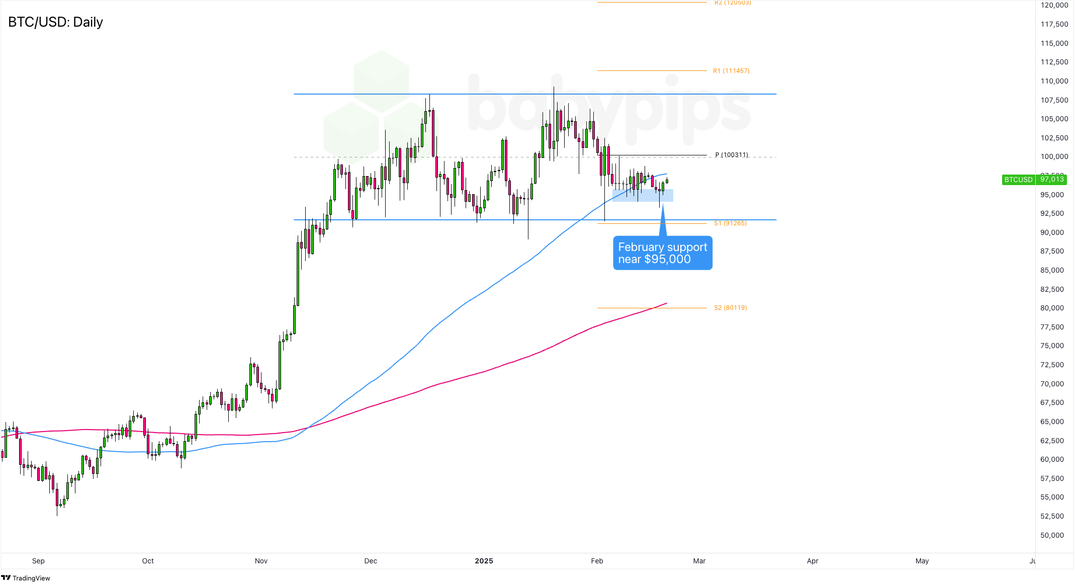 After sliding since mid-January, BTC/USD found support at the $95,000 psychological level. This isn’t just above the longer-term $92,000 support—it’s also hanging around the 100 SMA on the daily chart.