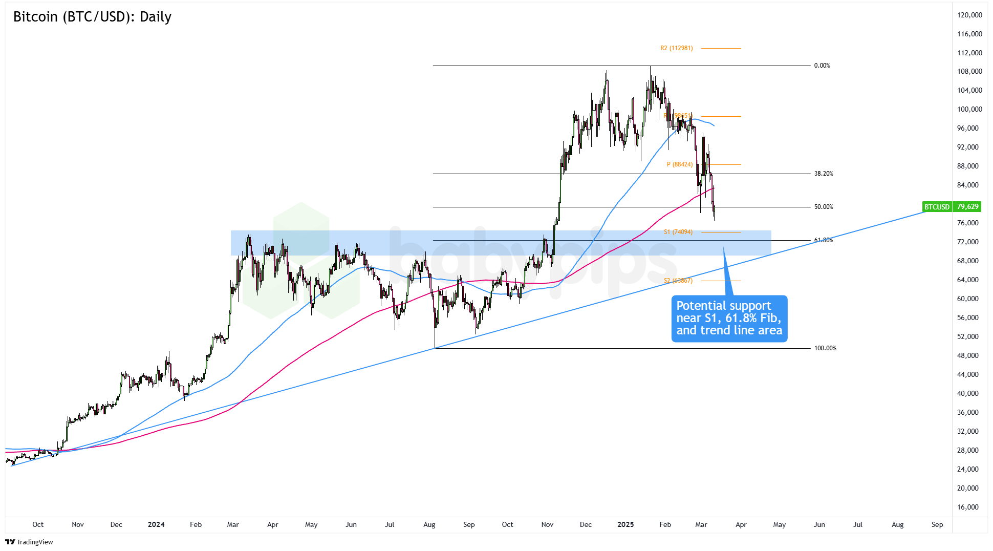 We are watching the $70,000 – $74,000 zone, which lines up with the S1 Pivot Point at $74,094 and the 61.8% Fibonacci retracement of bitcoin’s late 2024 rally. More importantly, this area is not far from a trend line support that has been in place since 2023.