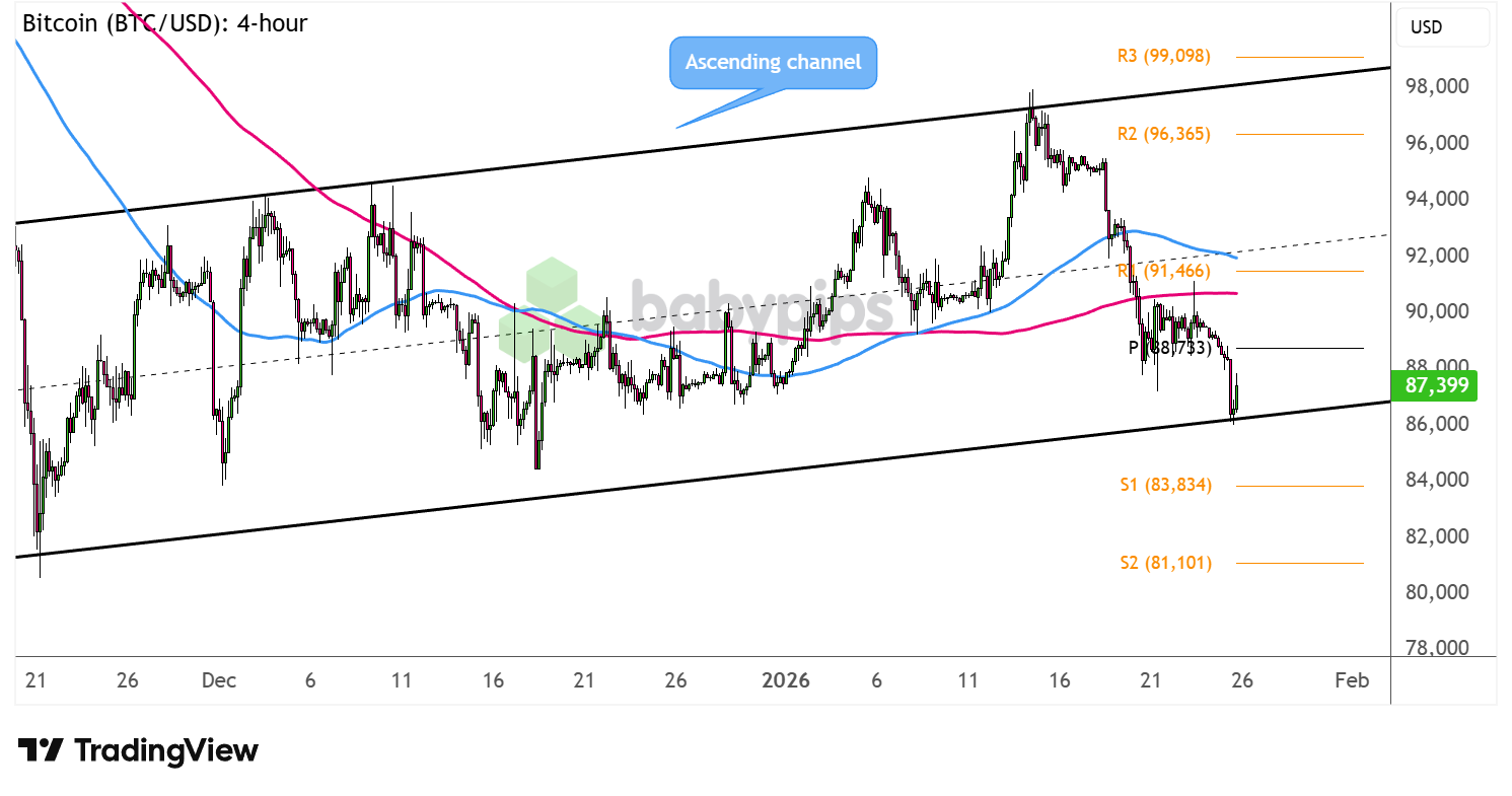 BTC/USD is already testing its ascending channel support around $88,000 and just below the pivot point ($88,733), still deciding whether to bounce or to break.