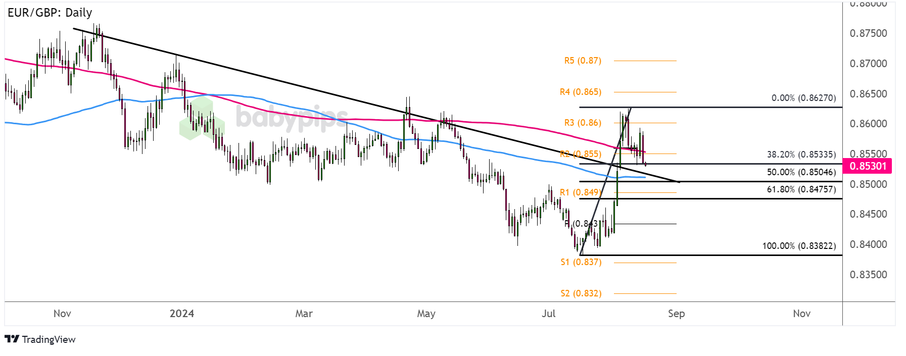 A larger pullback could test the 50% Fib that’s closer to the broken trend line around the .8500 major psychological support or the 61.8% level near R1 (.8490). If any of the Fibs are enough to keep losses in check, keep an eye out for a continuation of the climb back to the swing high near R3 (.8600).