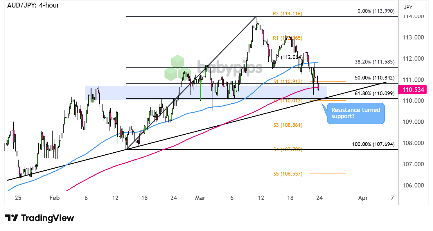 AUD/JPY is inching close to the 61.8% Fibonacci retracement level near S2 (110.01) and the 110.00 major psychological floor.