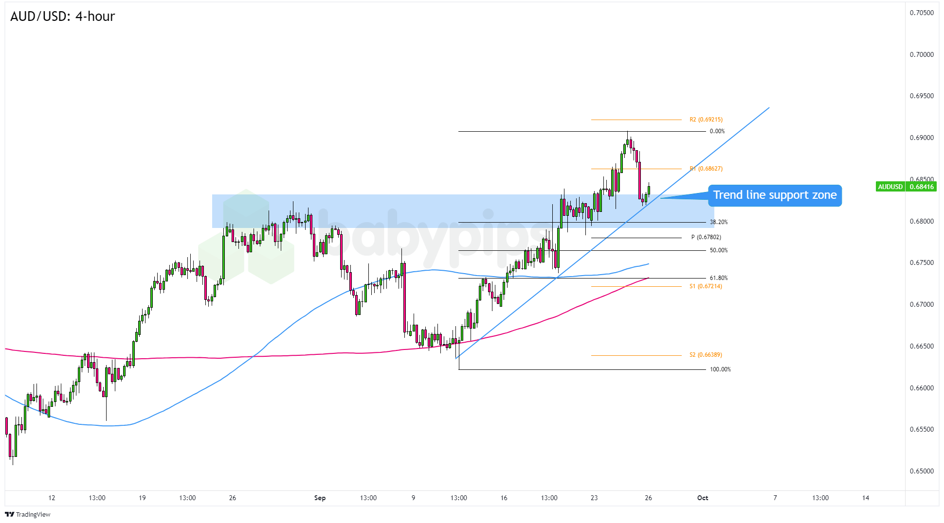 Sustained trading below the trend line and the .6800 support zone could lead to AUD/USD dropping to lower inflection points. In this case, we’re eyeing a potential drop to the .6725 – .6750 levels near the S1 (.6721) Pivot Point and the 100 and 200 SMAs.