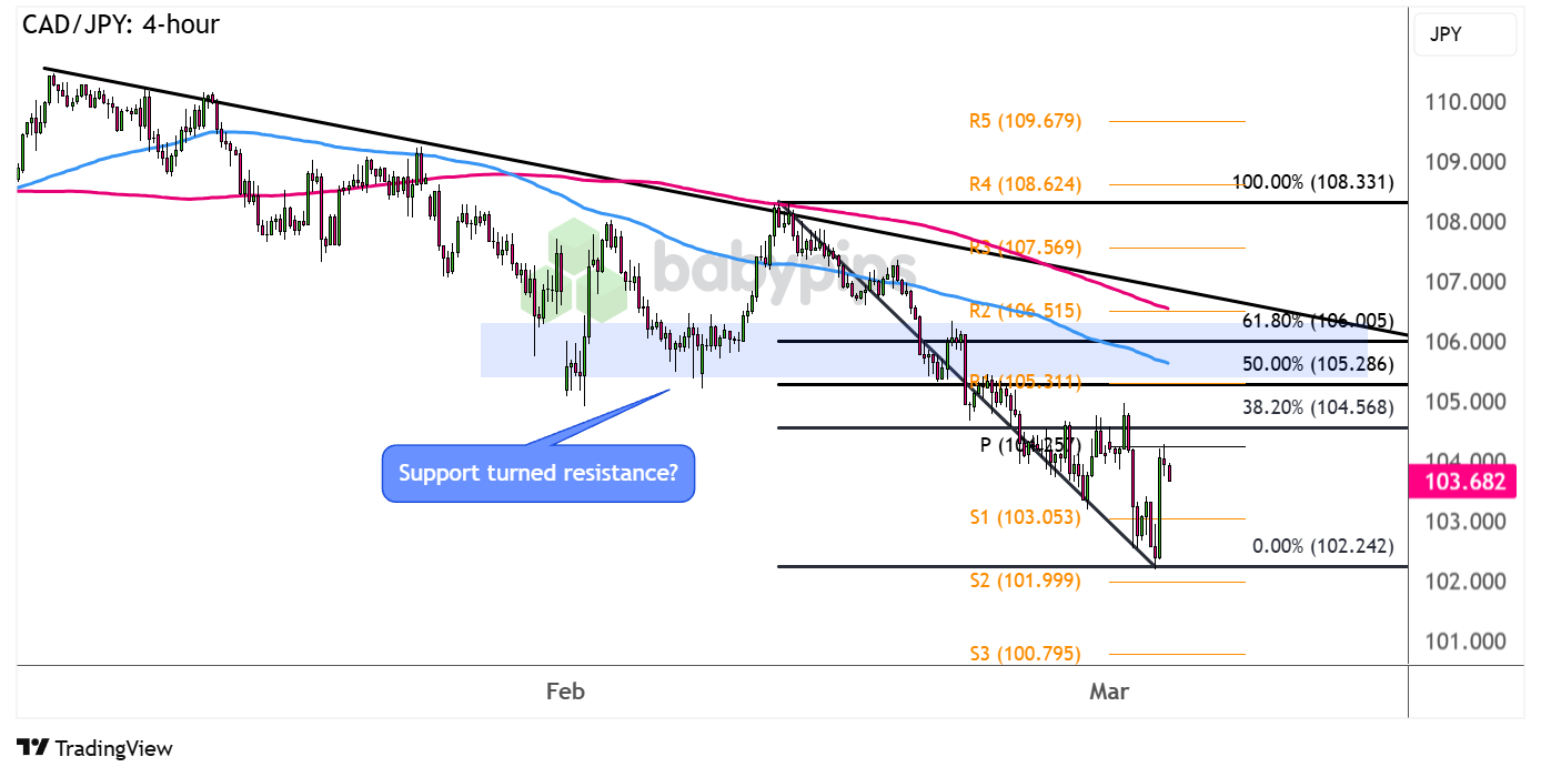 Price is closing in on the 38.2% Fibonacci level near the pivot point (104.25) but could still go for a larger pullback to the 50% Fib that’s right in line with R1 (105.31) or the 61.8% level closer to the trend line and 200 SMA dynamic resistance.