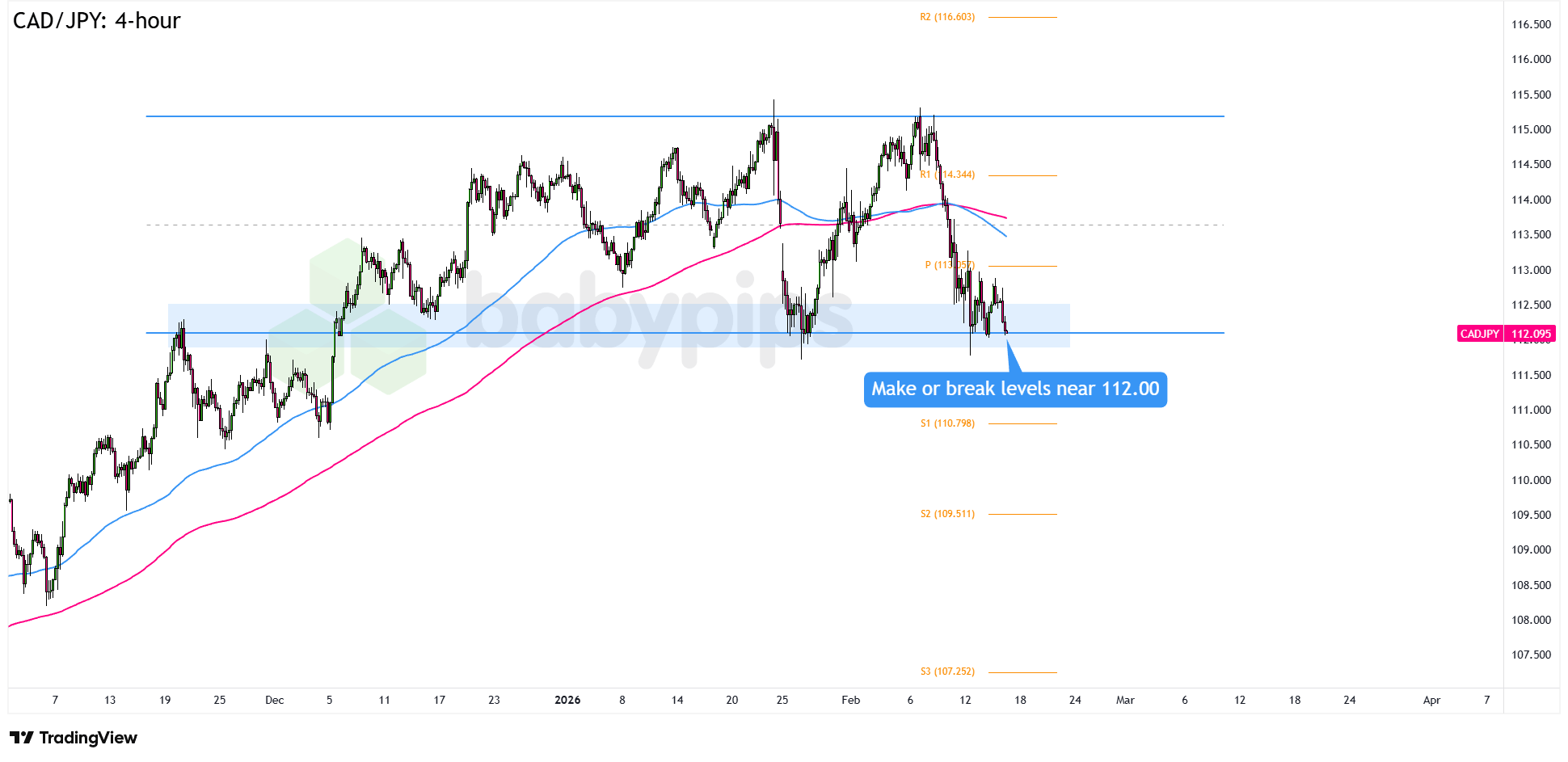Watch for strong bearish candles and sustained trading below 112.00, which could attract fresh selling pressure and pull CAD/JPY toward lower inflection points such as the S1 at 110.80 or the S2 support zone at 109.51.