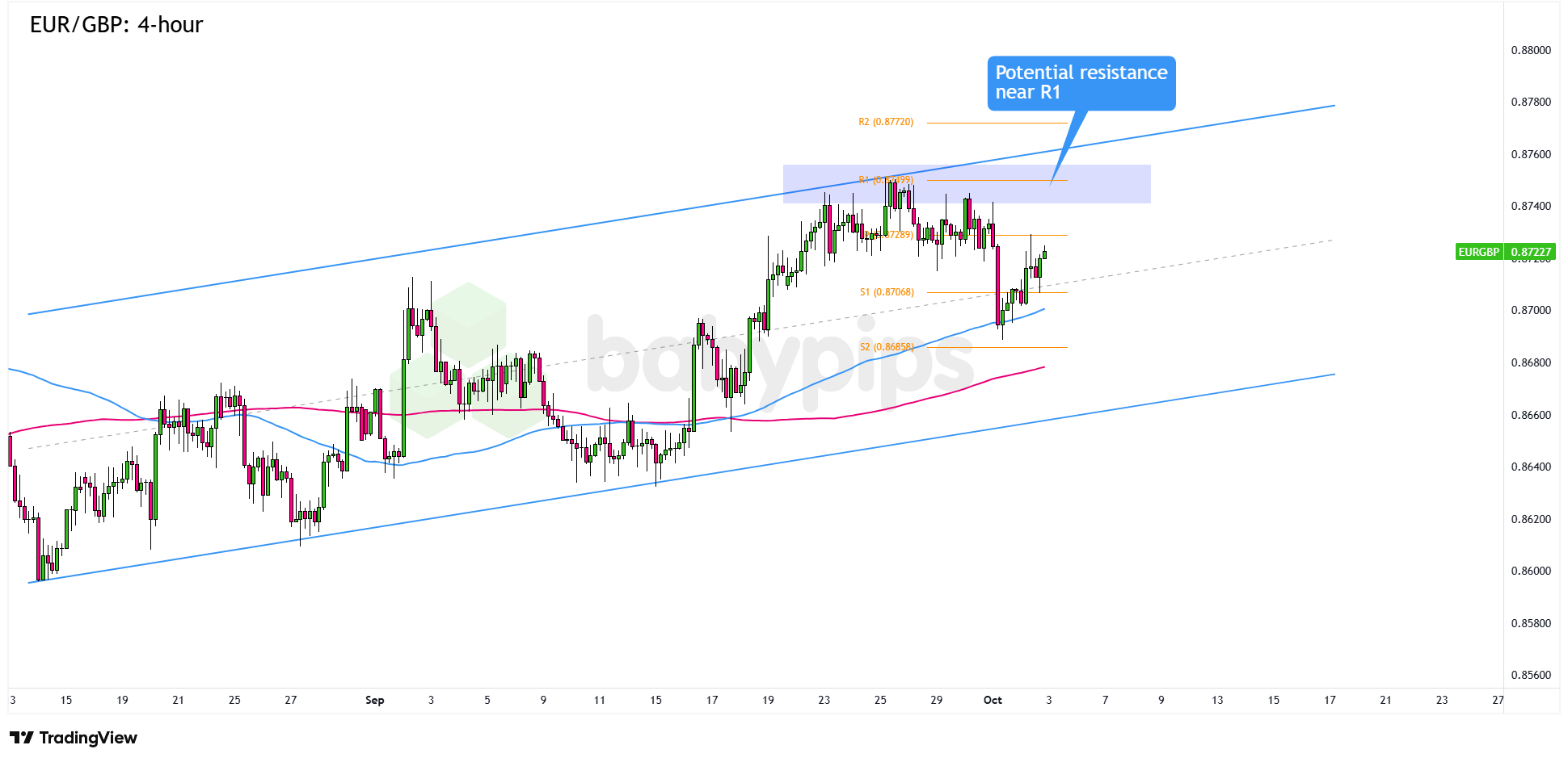 With that bounce, the pair looks set to retest the .8750 zone. The area lines up with the R1 Pivot Point, the top of the pair’s ascending channel, and September’s highs.