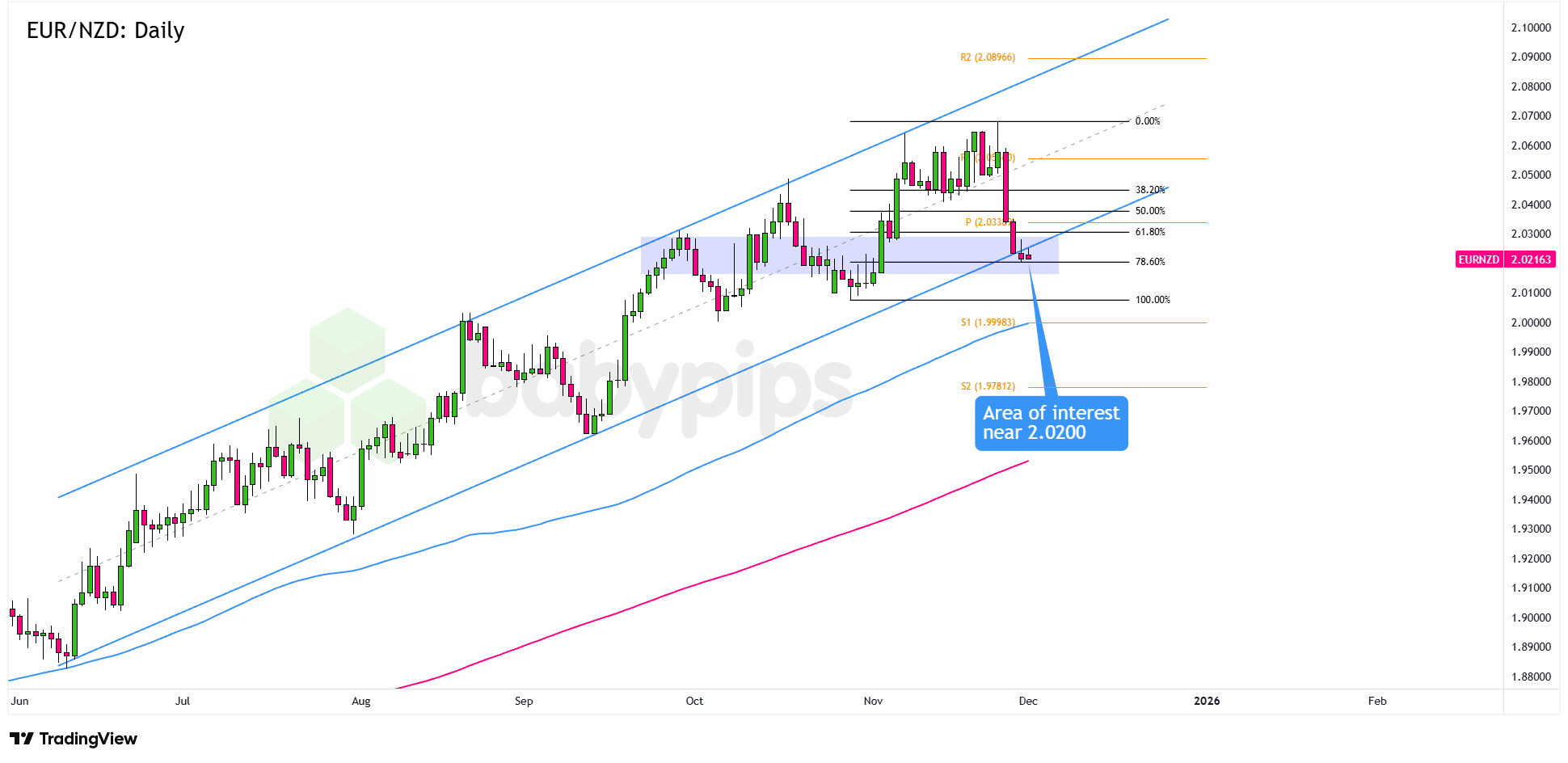 But if we get green candlesticks and a clean bounce off that channel support, EUR/NZD could swing right back toward the 2.0500 mid-channel zone and its previous consolidation area, maybe even taking a shot at fresh 2025 highs above 2.0700.