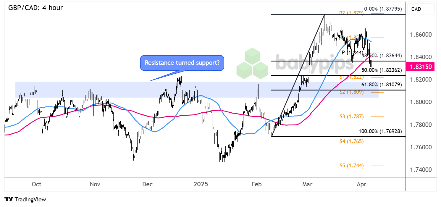 If any of these levels are able to hold as a floor, look out for a potential continuation of the climb back to nearby resistance zones at the pivot point level (1.8440) or all the way up to the swing high at R2 (1.8790).