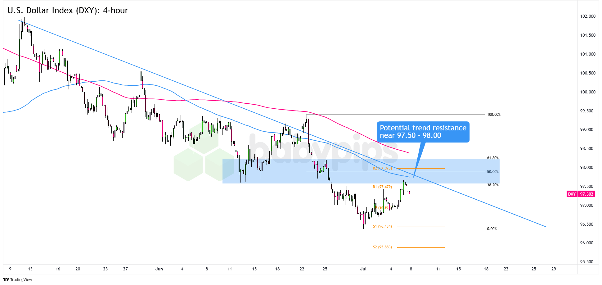 We’re keeping a close eye on the 97.50 to 98.00 zone. That area’s packed with technical hurdles, like the R1 Pivot Point at 97.48, the 38.2% Fib of the late June drop, and the 100 SMA on the 4-hour chart.