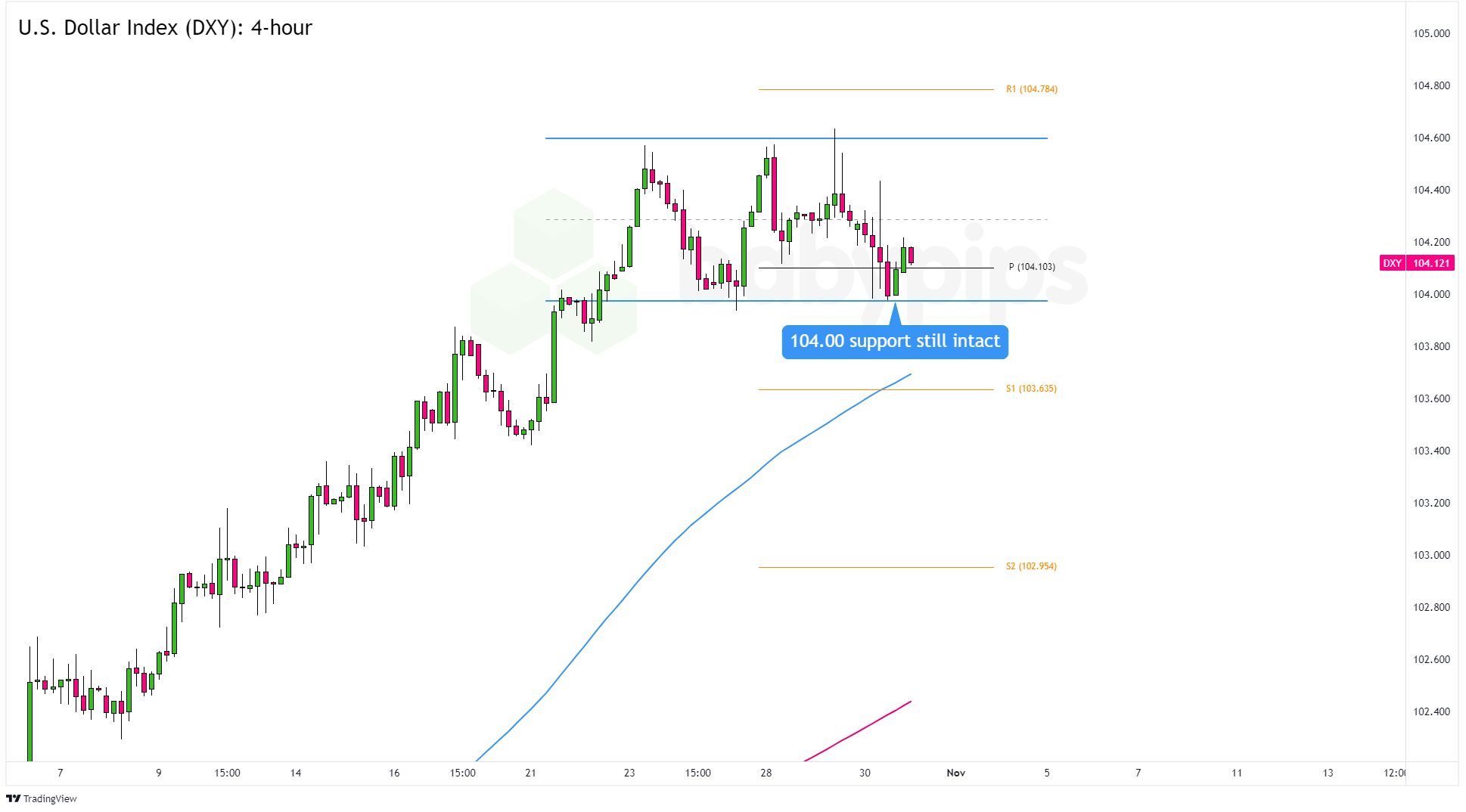 Watch out for more green candlesticks above 104.00, which is near the Pivot Point line (104.10) and range support area in the 4-hour chart. Further gains could bump DXY up to the 104.30 mid-range levels if not the 104.60 previous high and range resistance zone.